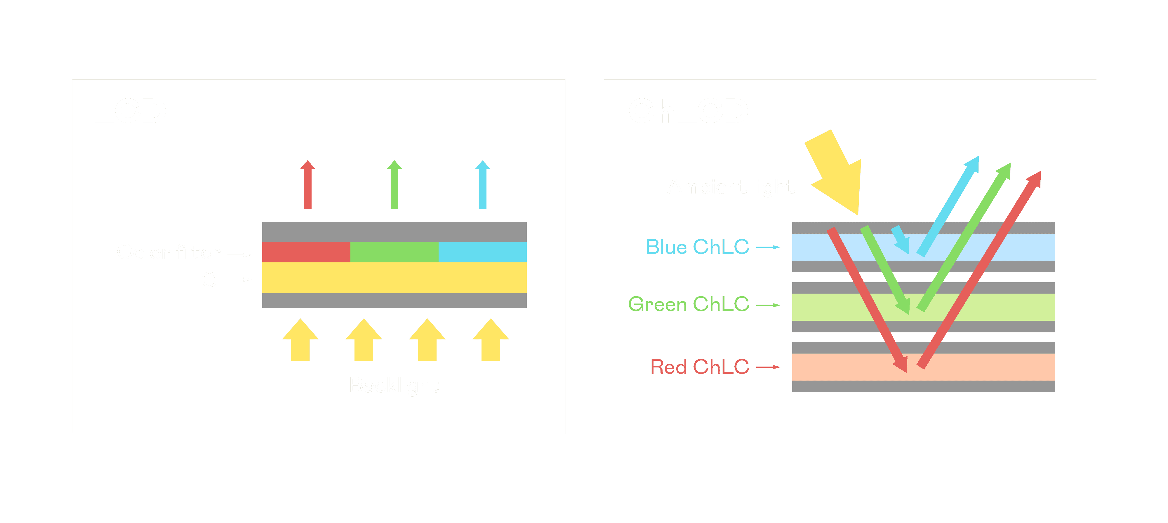 ChLCD 胆固醇液晶就如同纸张一样,,透过反射环境光来显示影像,,因此长时间观看不易造成人眼视觉疲劳,,,,可达到护眼效果。。当处于户外阳光下使用,,,LCD 影像容易失真而不易观看,,但胆固醇液晶仍可维持较佳的影像品质。。