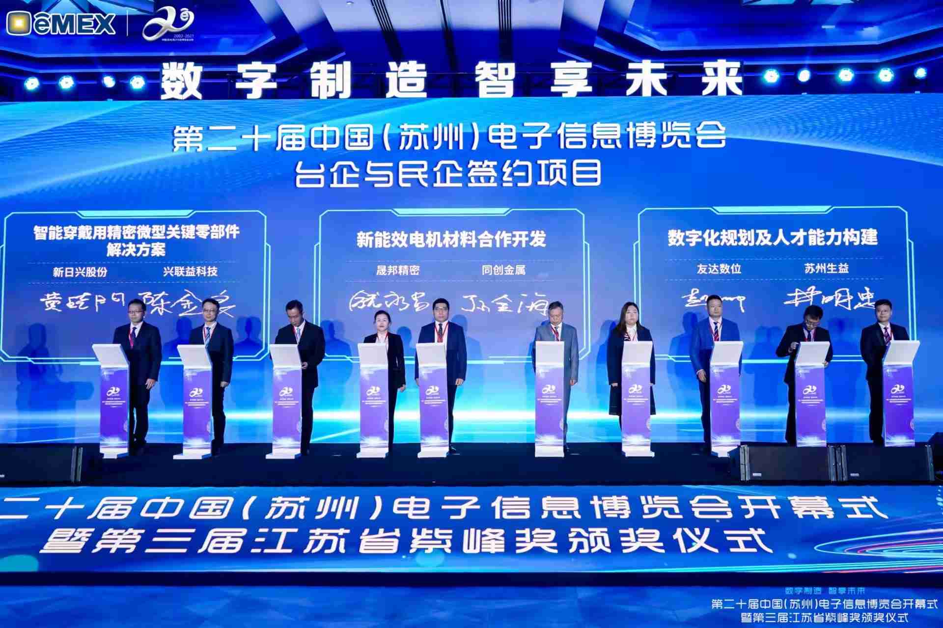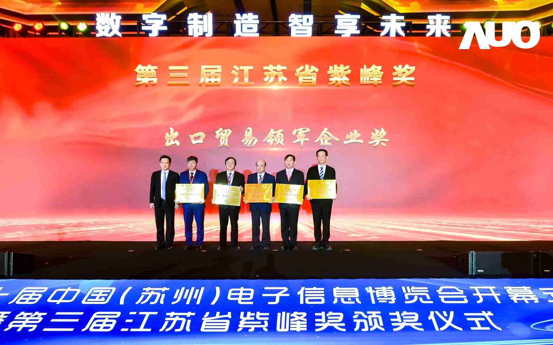 电博会开幕式当天也是第三届江苏省紫峰奖颁奖仪式,,,省台办、、、工信厅、、商务厅、、、、苏州市相关领导均出席并颁奖。。。该奖项为表彰对江苏高质量发展做出积极贡献的在苏企业,,由江苏省政府专门设立。。。。尊龙集团光电 (苏州) 总经理郭振明代表上台领奖,,,,这也是尊龙集团苏州连续三次蝉联紫峰奖 出口贸易领军企业奖。。。。尊龙集团数位总经理赵丽娜女士,,也参与本次开幕式,,,上台为本地化赋能签署战略合作协议,,,,将优质服务资源集合、、下沉到更多细分行业,,,为更多地区的制造企业提供数字化转型服务。。