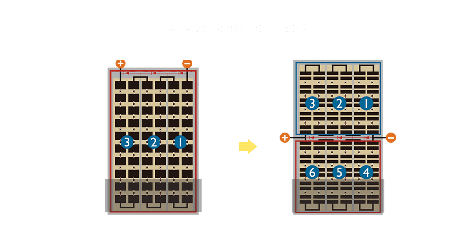 - 电池使用多条铜导线 (Copper wire) 于电池片上形成较短的电流路径,,,提高电流收集效率,,,采用圆形设计的铜导线较传统扁平式的铜焊带 (Ribbon),,可增加入射至电池的光线量。。。。